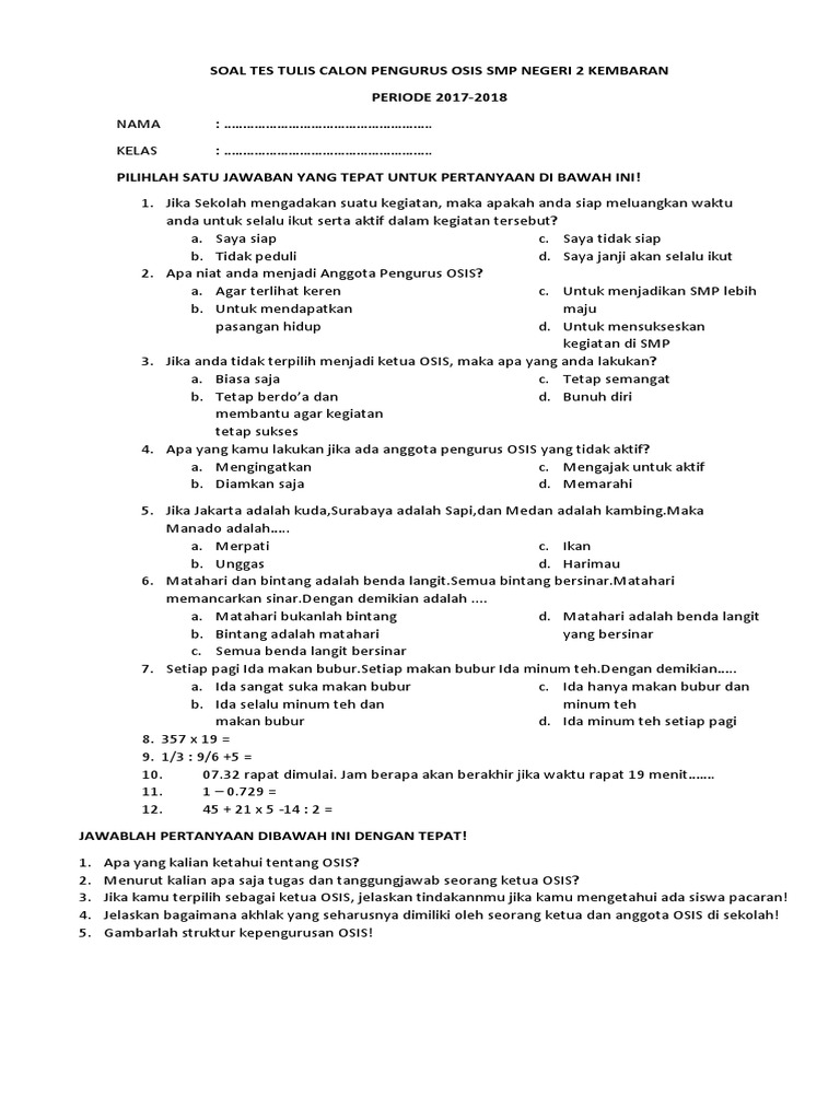 Jadi jangan heran jika pertanyaan untuk calon ketua osis terkadang begitu 'mendalam'. Contoh pertanyaan dalam debat calon ketua osis pertanyaan untuk calon ketua pradana, 23 07 2019 contoh 17 pertanyaan jebakan saat interview dan cara menjawabnya pertanyaan untuk calon ketua pradana, untuk mempersiapkan diri anda perlu mengetahui seperti apa pertanyaan. Kalau kita mau berprestasi yang kita ubah. Kalian ketua organisasi?, pastinya ingin menjadi ketua yang berkualitas kan. Sebelum menjadi ketua atau anggota osis tentunya ada orasi yang disampaikan bakal calon contoh soal pg untuk perilaku keorganisasian.